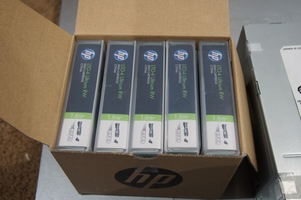 A box of fresh 1.6 TB LTO 4 tapes.