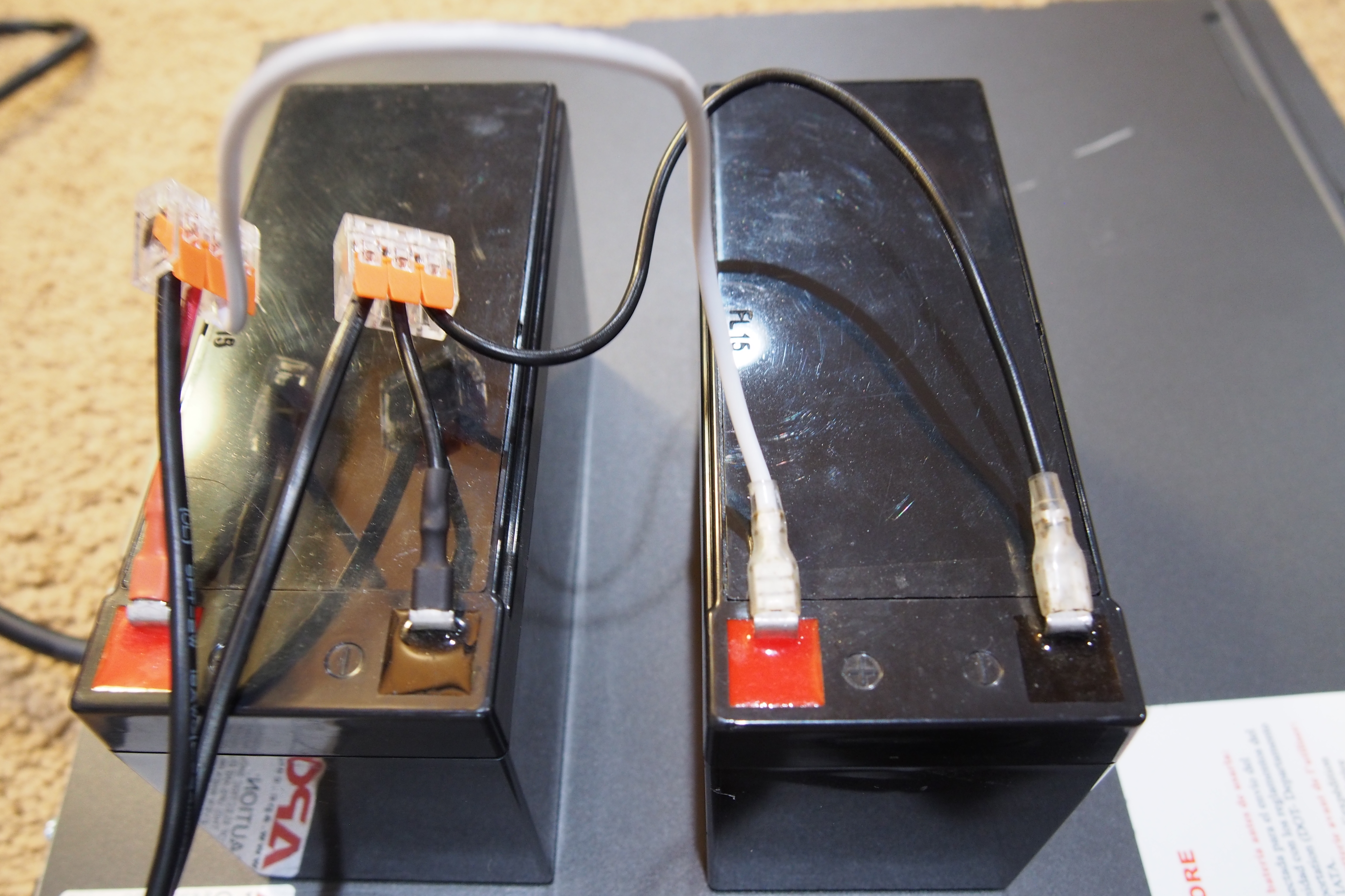 The large batteries wired together.